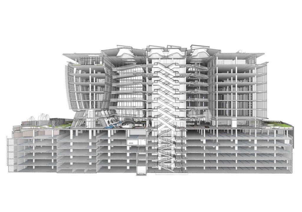 The project accommodates 2400 sited working staff members. It also incorporates an extensive